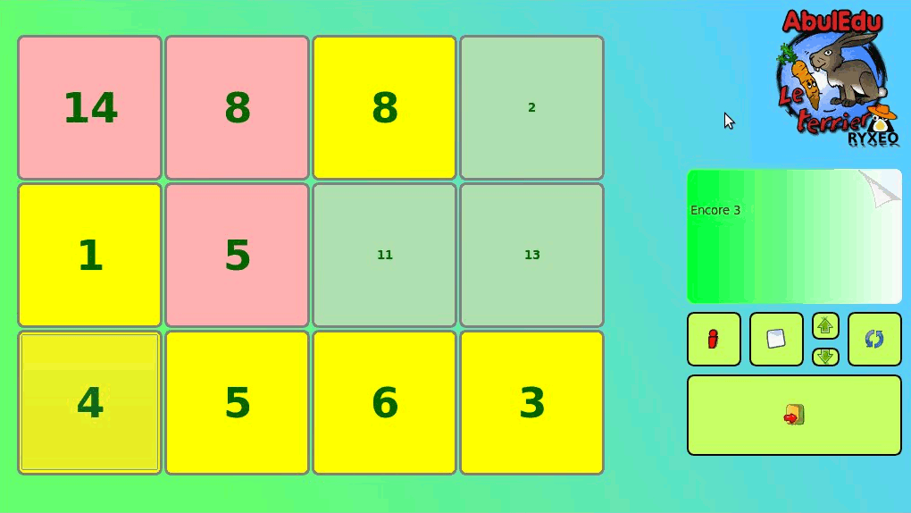 Il faut retrouver le nombre manquant dans la suite proposée en désordre : Cliquer sur la case marquée par un point d'interrogation, saisir le nombre au pavé numérique, puis valider. Lorsque le nombre est bon, il s'affiche et l'exercice suivant est proposé (bouton Nouveau).