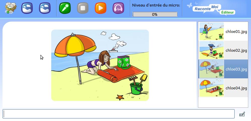 Raconte-moi permet de créer des “albums” associant images et sons sur le principe du tourne-page. Le logiciel comprend un mode auteur et un mode lecteur. L’éditeur permet de créer l’album en sélectionnant les images et en enregistrant les sons à utiliser. Le lecteur permettant de visionner l’album (les albums) précédemment créé(s). Un module d'export internet vous propose de générer un album au format HTML5.