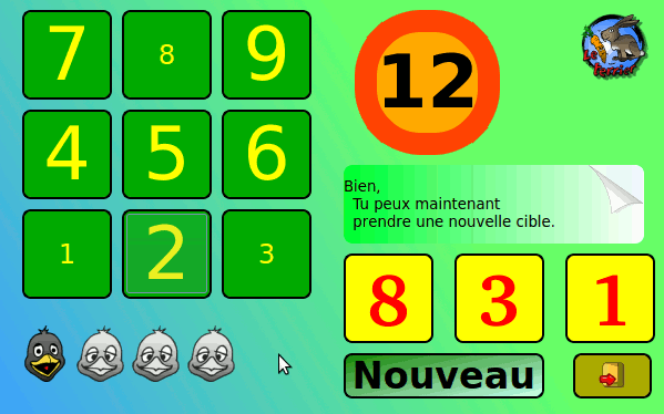Règle du jeu: Un nombre est proposé au joueur : c'est le nombre-cible, celui qu'il faut atteindre en 3 coups. Le joueur choisit un à un 3 nombres parmi un lot (de 1 à 9). Chaque nombre n'est utilisable qu'une fois et une seule. Il ne doit pas atteindre le nombre-cible en 2 coups ; il faut donc qu'il prévoie la possibilité de compléter au troisième coup. Cependant le jeu avec joker permet d'utiliser plusieurs fois le même nombre.